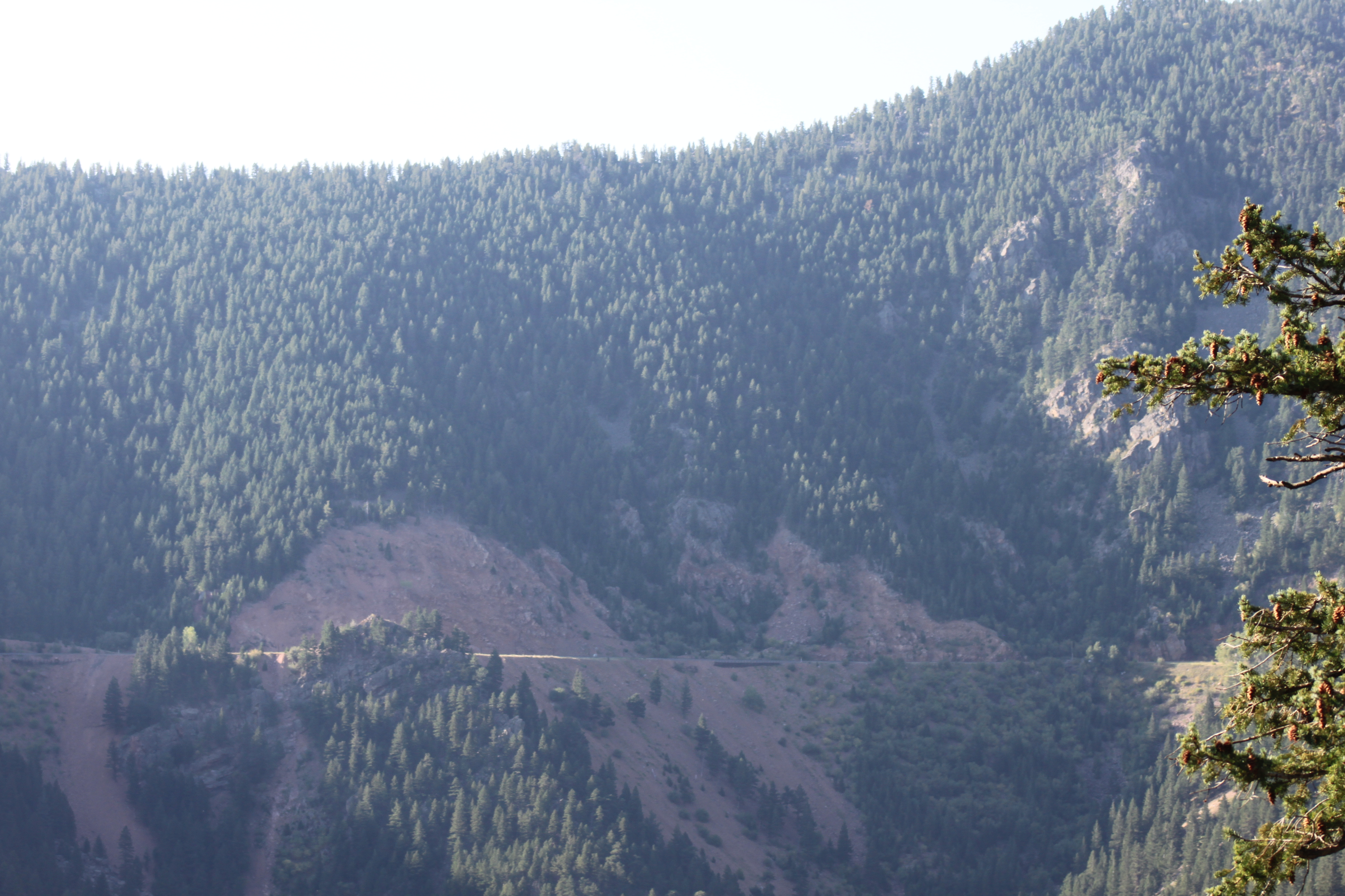 The state park people have put in a lot of stairs to help get up this climb, both made of rock and some with wood starts. Some of these steps are a big step up and my chubby legs were working hard to get up them. So be prepared to do some hard core lunges. As we climbed up this first ascent, it was hard to keep our eyes on the trail because the views were so amazing! There are train tracks on the other side of the canyon and we actually saw a train going by on the way back. You also can see the Continental Divide peaking over the closer mountains at this point. I did get pictures but the haze from fires in surrounding states makes it hard to see: