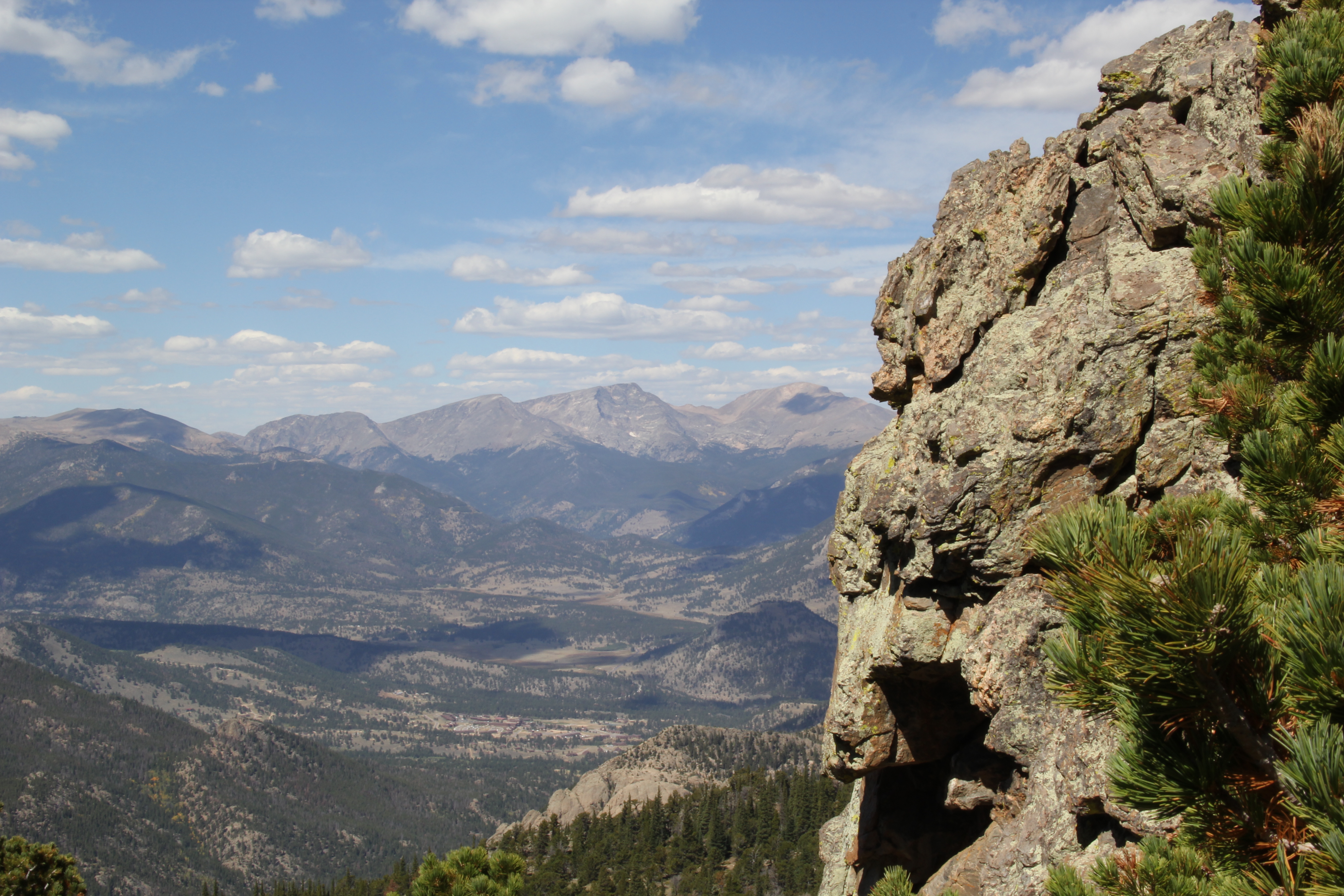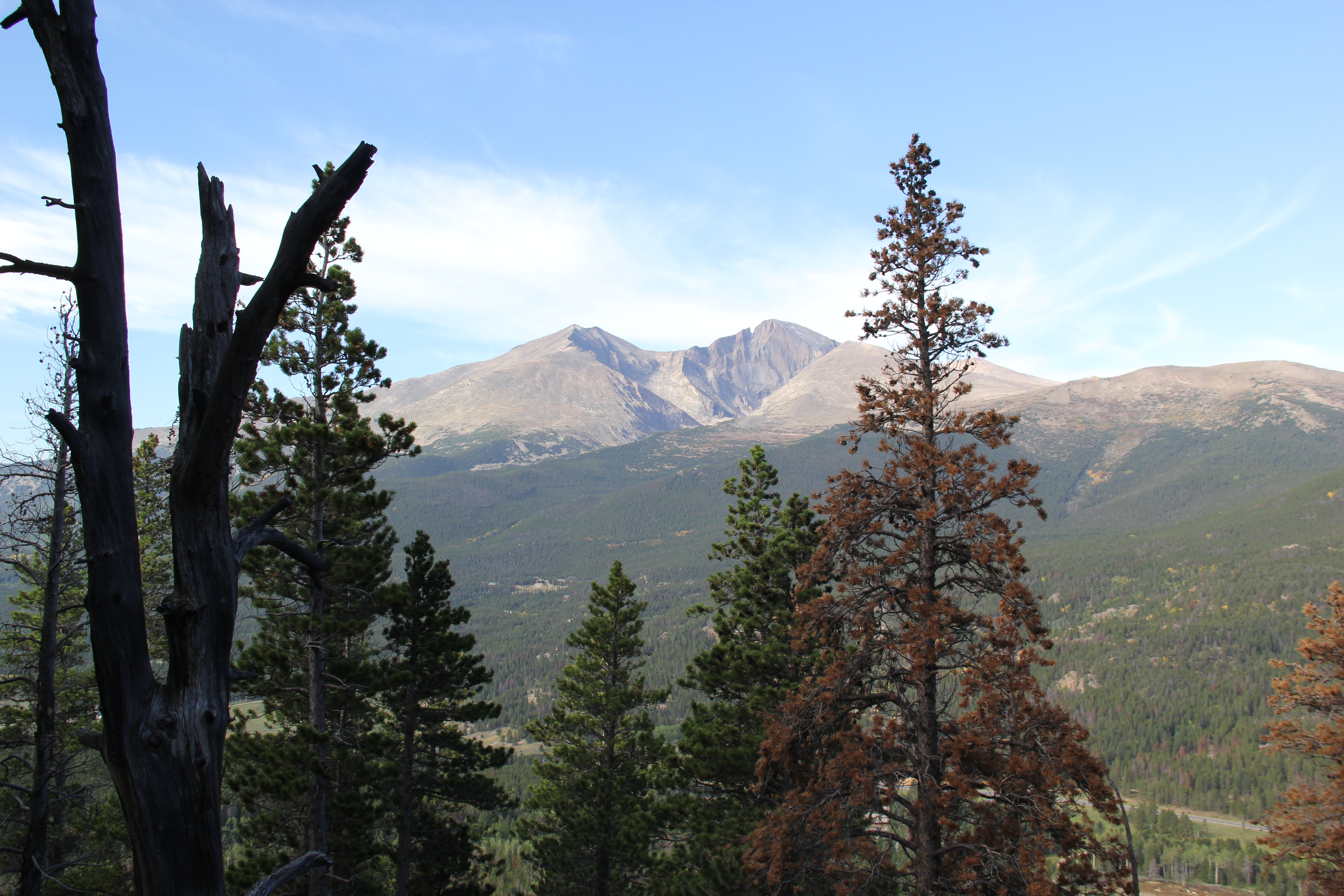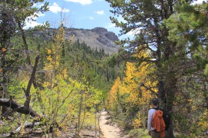 It is mostly shady throughout the lower part and you get peeks of Long’s peak and its brothers and sisters all around. At around a mile in, there is a nice clearing and you get an unobstructed view of Longs peak in all its glory: