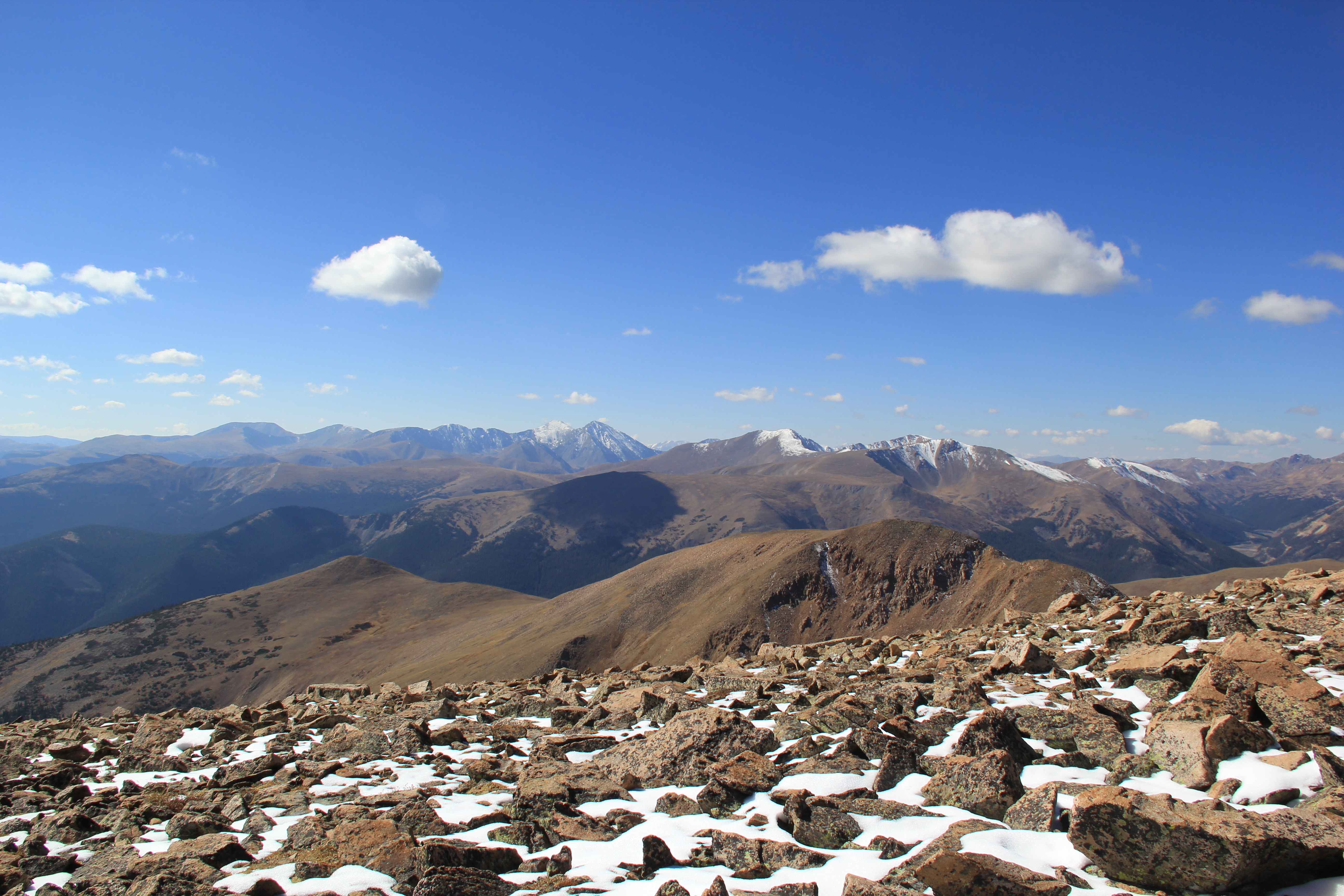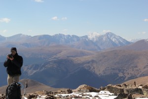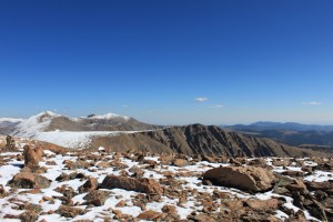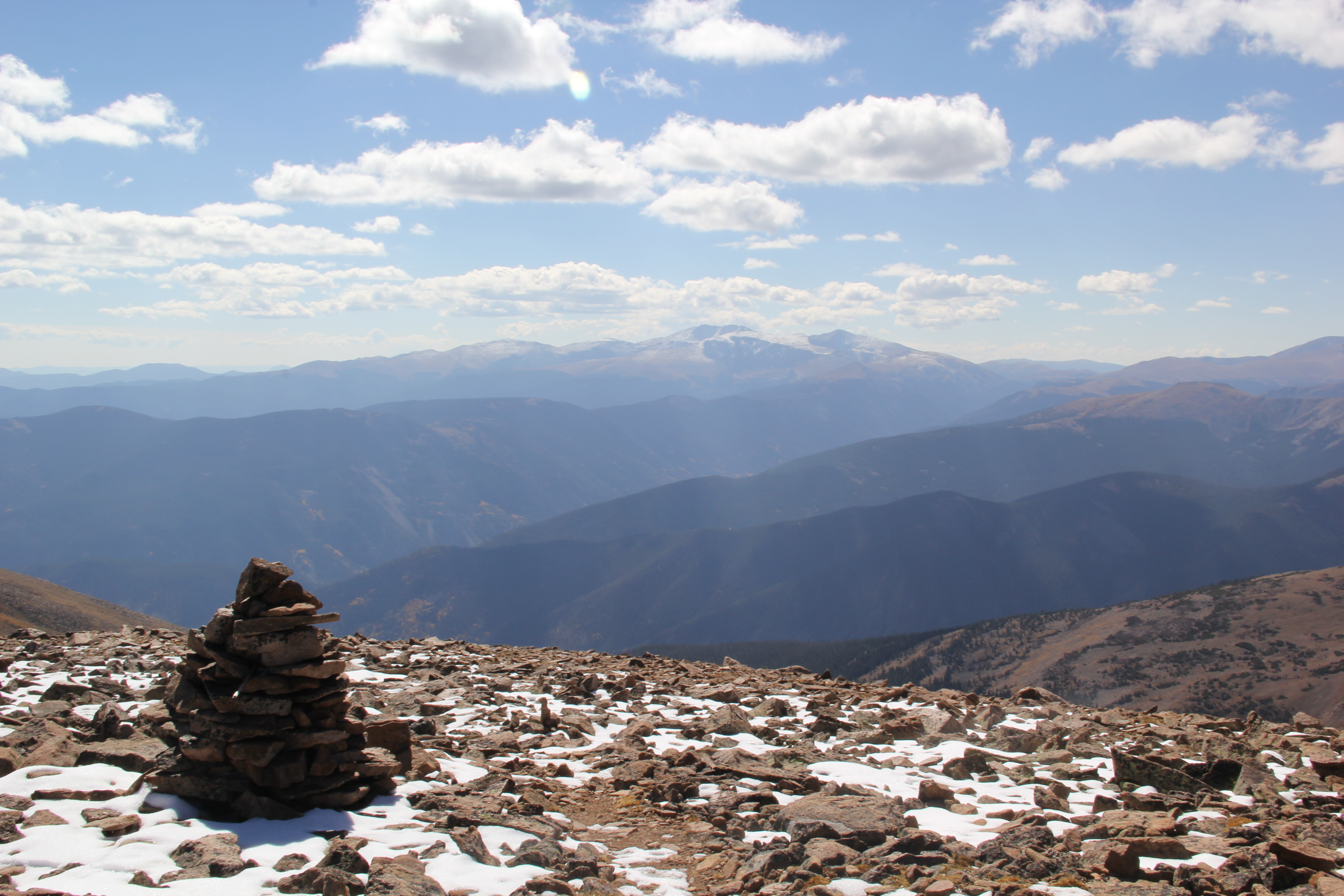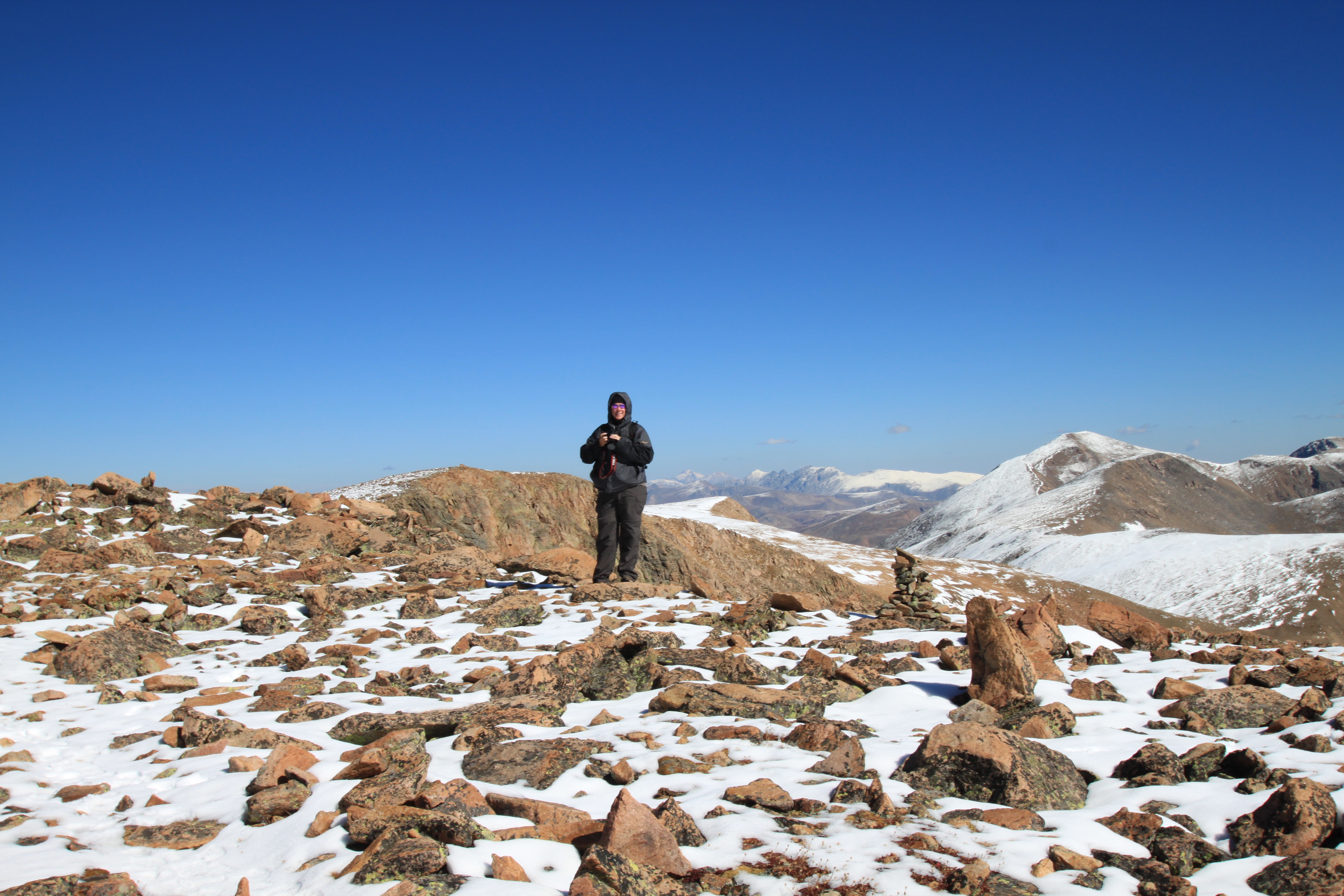 From here it was pretty straight forward, as we got closer to the saddle between Mines Peak( on the right) and Mt. Flora( leftish- straight ahead) the wind really picked up and the snow was now regular. Here we had a really pleasant surprise, one of my coworkers was headed down with her husband, and Wendy is my hiking superhero so seeing her there was a great rush. The trail than climbs what other hikers referred to as a false summit, past this boulder bump just keep moving it is half a mile to the summit from here. It is a pretty flat summit and there is a nice little wind shelter just to the left of the big cairn, which was a nice break at that point in time. It was COLD! Fortunately we had packed a lot of stuff to keep us warm, hats, neck warmers, mittens….. if we needed it, we also had long underwear tops and bottoms along with extra socks. Aaron carries a nice backpack and it holds everything we need in case of multiple situations plus water for him. I always joke that for every pound I lose, he has to add it to the backpack for him. It works for me but eventually I will probably have to start working with my own backpack…. We did not take our time capturing images on this one because of the cold, we gave ourselves 20 minutes and then packed up and headed down to a warmer altitude. So our pictures aren’t too great….