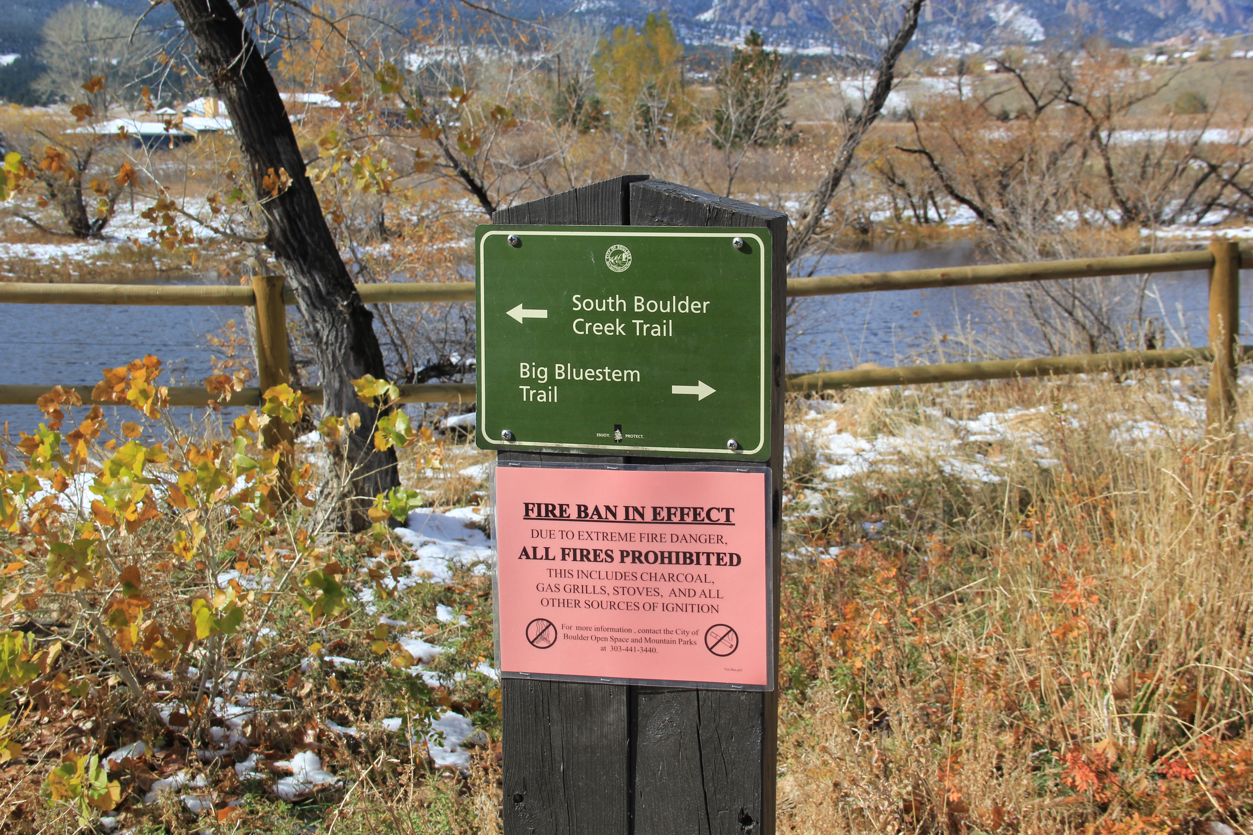 Pets: At this time of the year, dogs only on leash unless they have the special “green” tag that means they met the Boulder voice command requirements. Boulder take this seriously the only dogs off leash had the green tag which meant something to me. I gathered from the signs that until spring passes bears are a big concern and so the need for dogs on leash….
