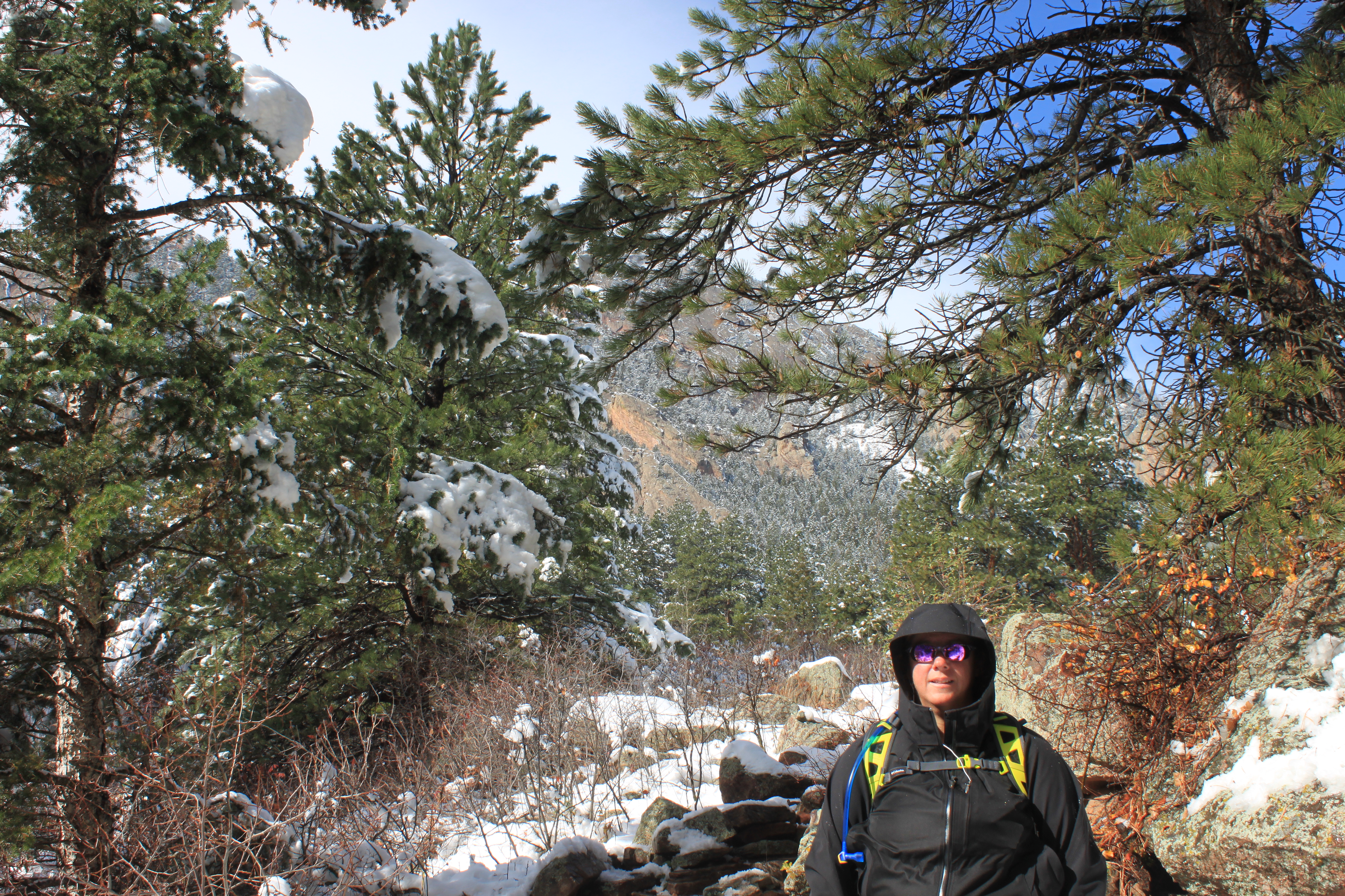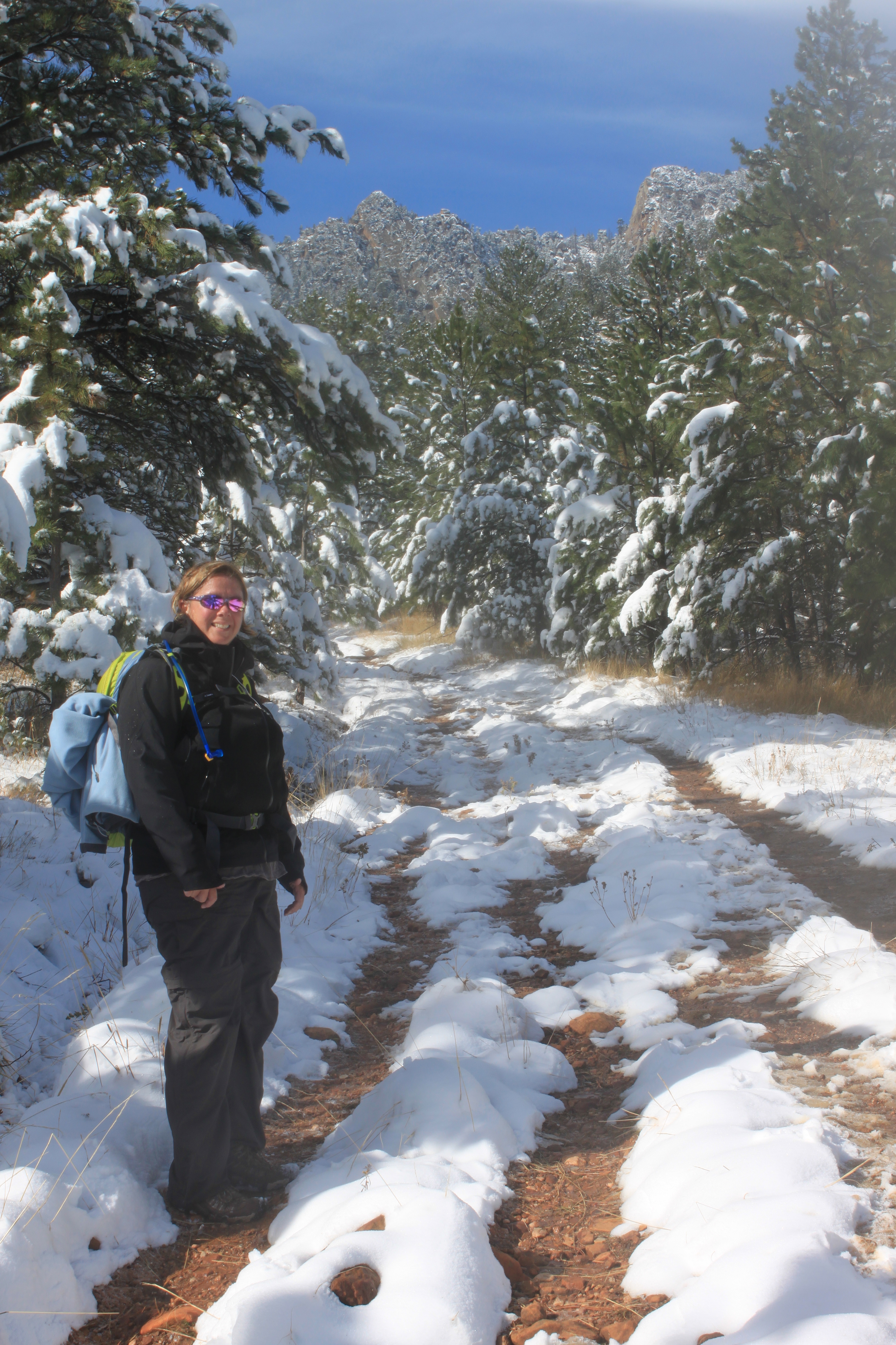 Lesson 2 of hiking in the winter in Colorado a day after a snow fall…..Rain in the sunshine. This first part of this trail is in the sun and then as we climbed the Mesa trail we started to get some tree cover,unfortunately those trees were covered in snow, which was melting in the sun and randomly dropping its load. Now I was full-out sweating already, but then I started to get pelted by pine rain so I put away my camera to protect my baby from all that moisture. It was not 5 minutes later before I got hit with a full branch of snow, then the challenge of extra mud. Which made an easy trail much harder. The picture above is my fake smile where I am repeating this mantra ” I love hiking”. I could tell those runners passing us with mud spatters up to their thighs had the same sort of mantra in their heads.