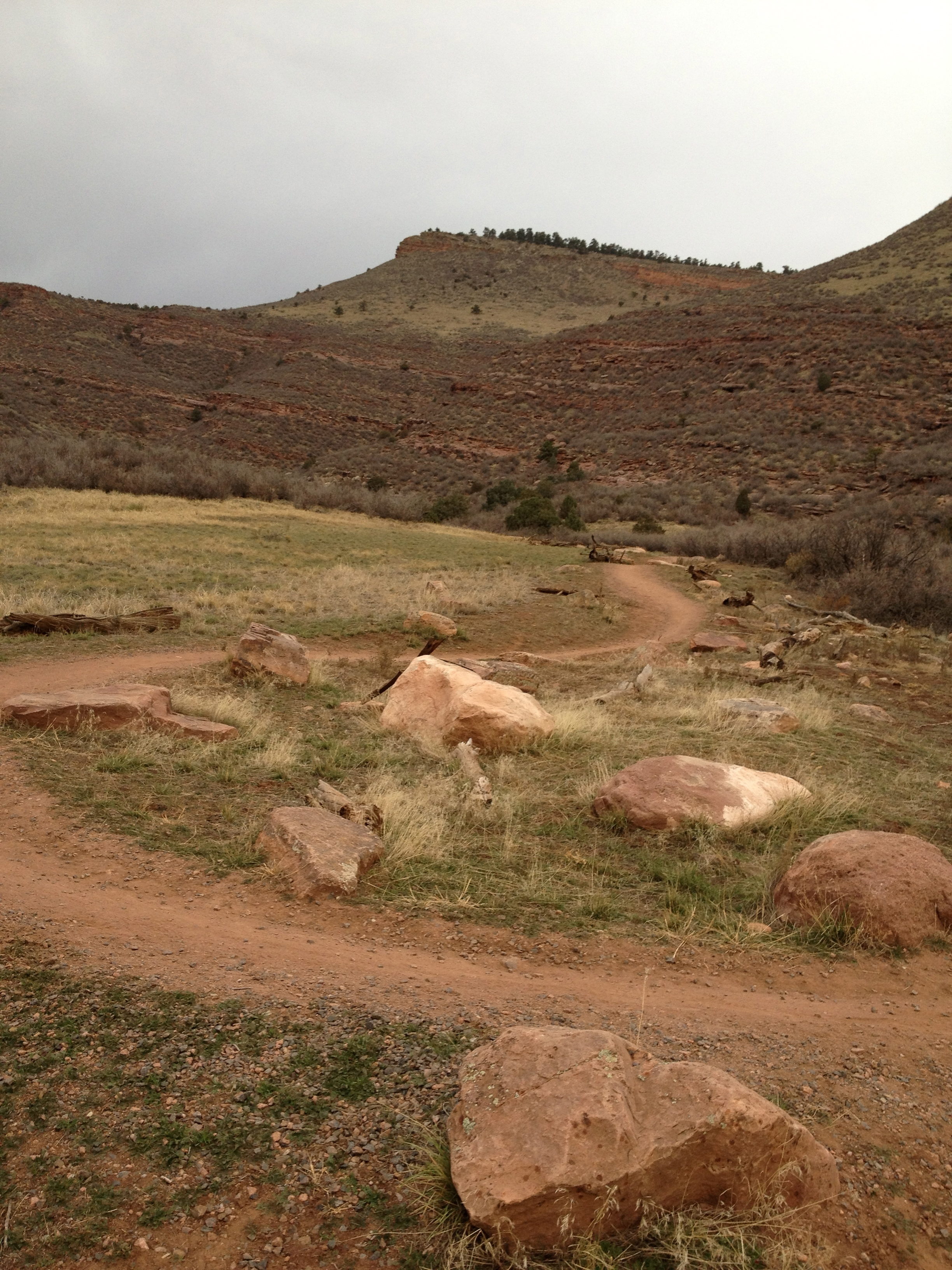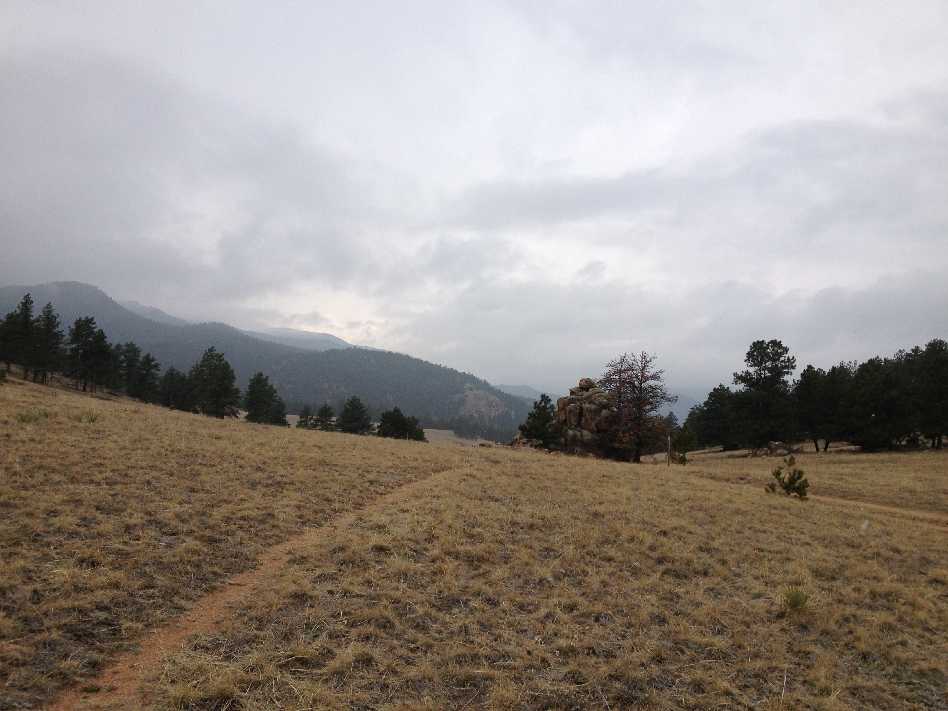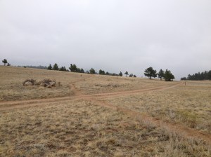 At about 4.5 miles we came to the Button Rock trailhead, which is a 2 mile outcrop that leads to other trails not all part of Hall Ranch.  I think that if the weather had been different this is where we would have seen Long’s Peak and Mt Meeker, but with the snow starting and with the clouds getting thicker, we were lucky to see any mountains at all.