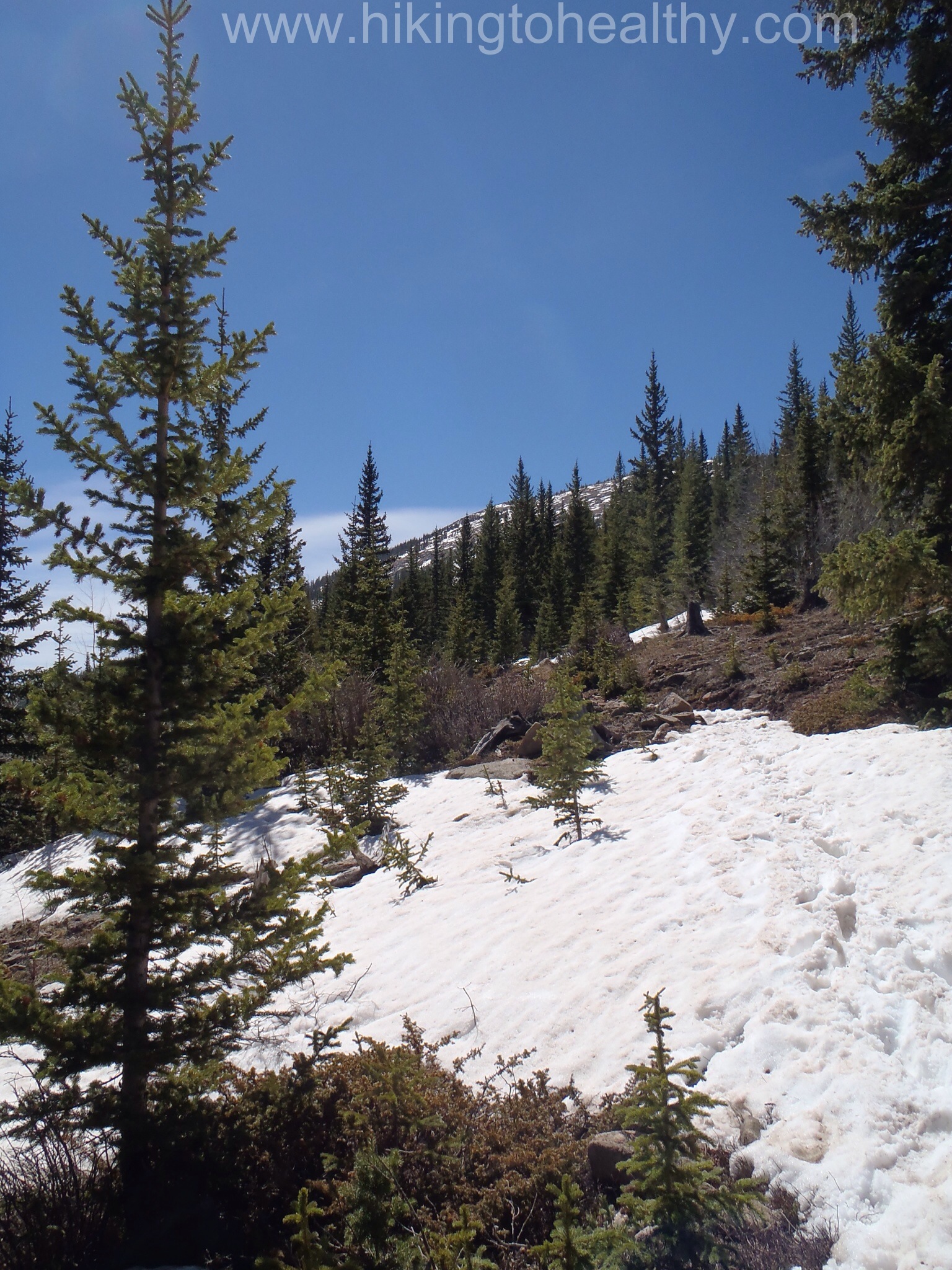 Ahh how we are gluttons for punishment! This past week was another perfect, warm week in Denver and as a result we convinced ourselves that we would try Ben Tyler ( Hike Details here) this weekend in hopes the snow was manageable enough to make it to the top. I cannot tell you how desperate I am getting to see the top of this hike and so the hike started out almost perfect plus we heard other hikers talk about the peak as if it was clear. We started up the switchbacks pretty optimistic and as we took in the view around the 2nd or 3rd traverse we started to wonder….