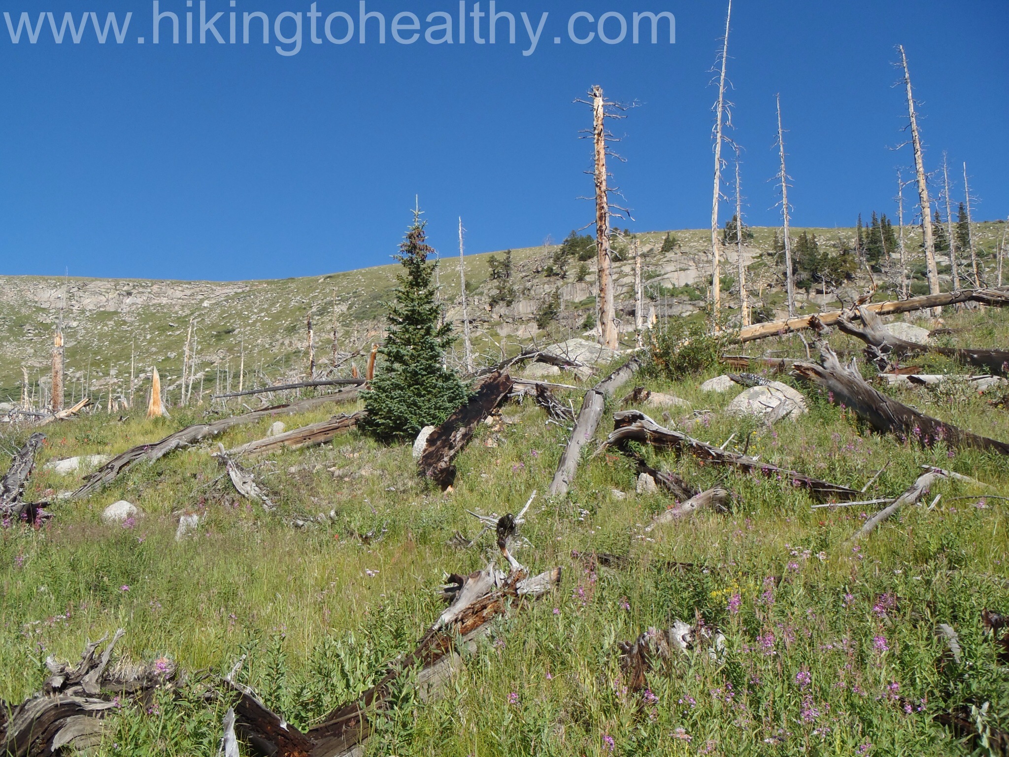 As we crossed over to the Mt. Evans Wilderness, the trail went back to single track and starts climbing more aggressively through an old burn scar from a fire in the 70’s. As it flattened out for a short stretch, the wild flowers were everywhere and the views of mountains on either side of us was pretty amazing.