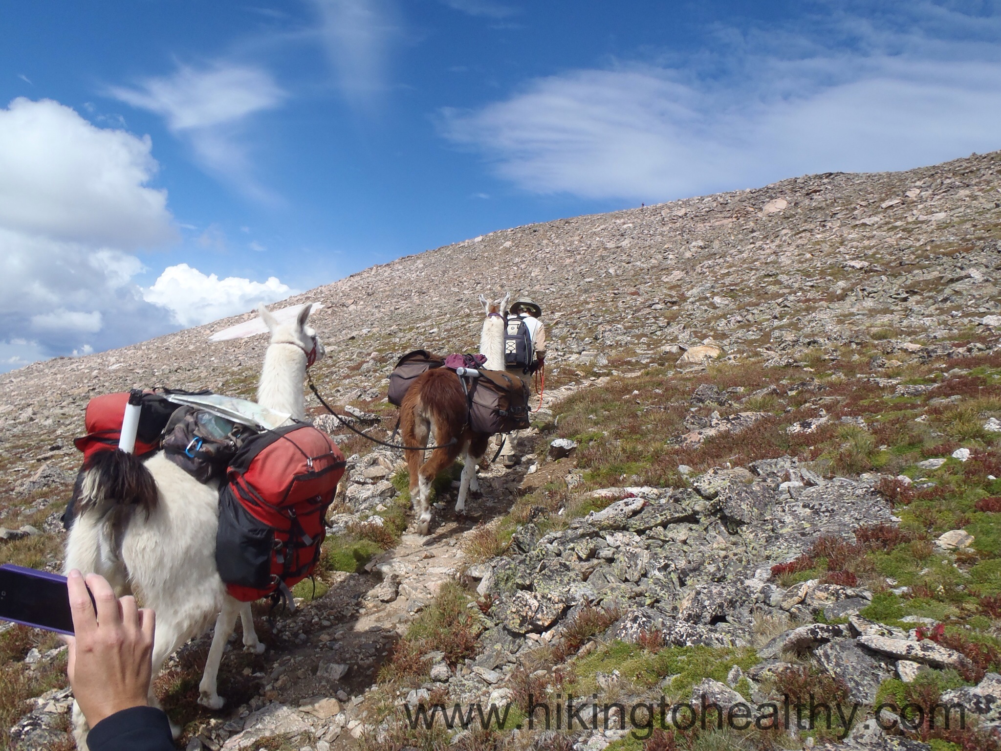At the top we had it mostly to ourselves and one other couple, who were a wealth of hiking information. Before I knew it, we had been talking to them for almost an hour! We quickly got some pictures and then headed down as the summit started to get more crowded. On the way down we saw this gentleman come up with his Lamas or alpacas, who were clearly very well-loved, I think he was a continental divide trail through hiker. How cool to through hike with these companions!