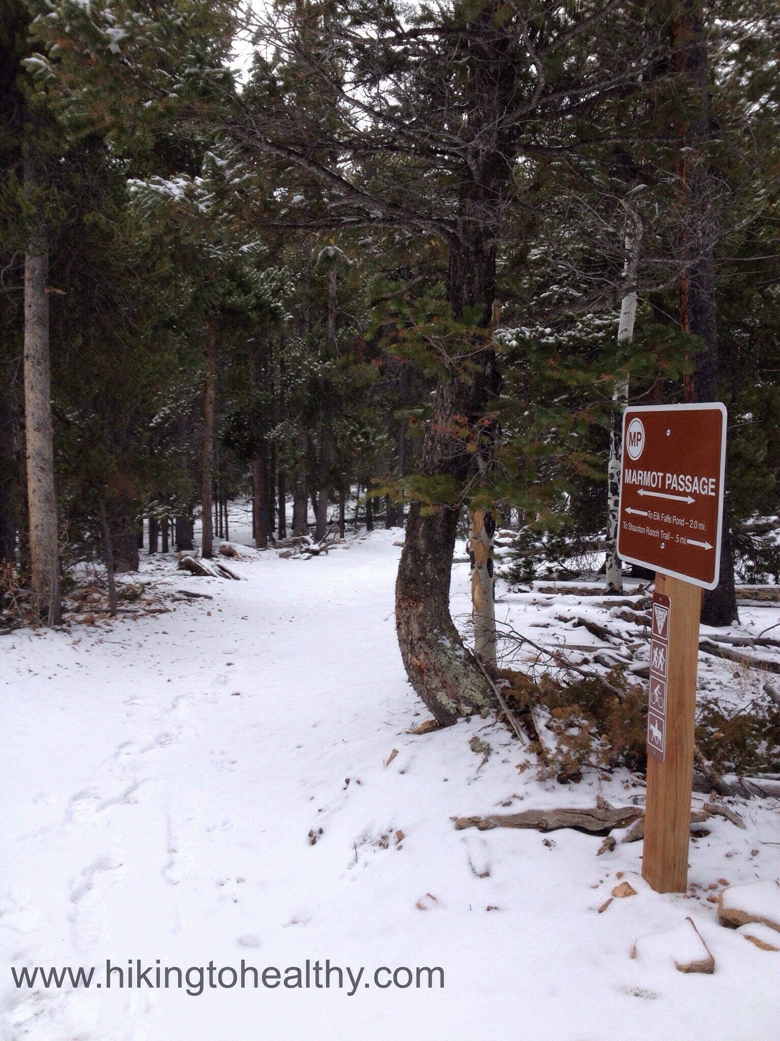Marmot Passage is an easy trail that does a little climbing and then mostly heads back down.  It actually started getting pretty cold while we were on this trail and so we started moving much faster.  As we descended to the Elk Falls Pond, the cloud cover really settled in but the pond still looked pretty from above, it could not dampen our excited and joy.