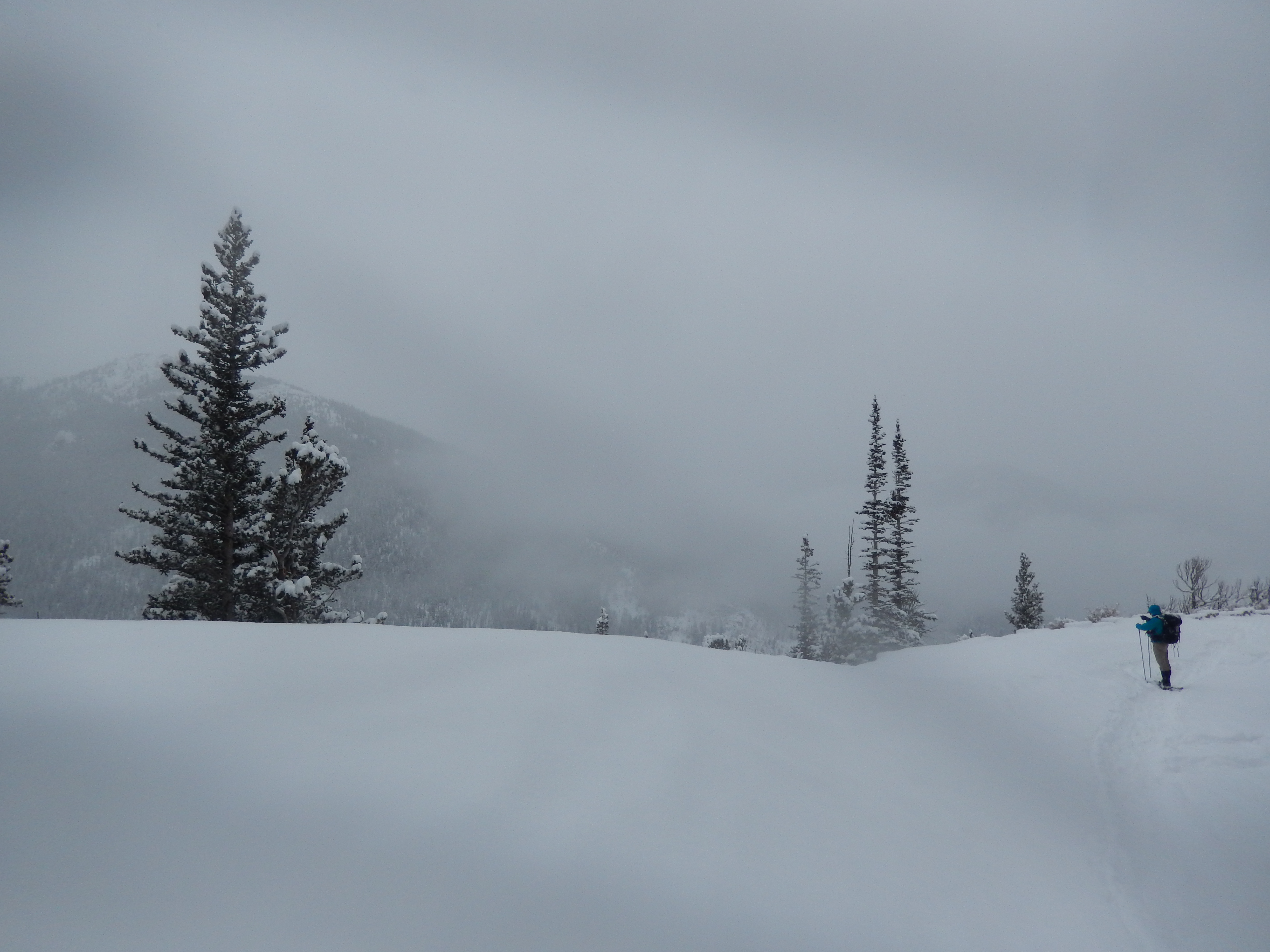 I have been trying to figure out the balance when it comes to snowshoeing, is more mileage better or steeper trails?  Since last week we did a steeper trail with low mileage that felt good and maybe a little too easy.  I decided this week would be better to up the mileage and keep the incline low, I was also secretly hoping we might get some magic timing again like last week and catch  the amazing views that Trail Ridge Road is supposed to have.   Once again the weather forecast was snowy…snowy the day before, through the night and all day Saturday and it truly was.