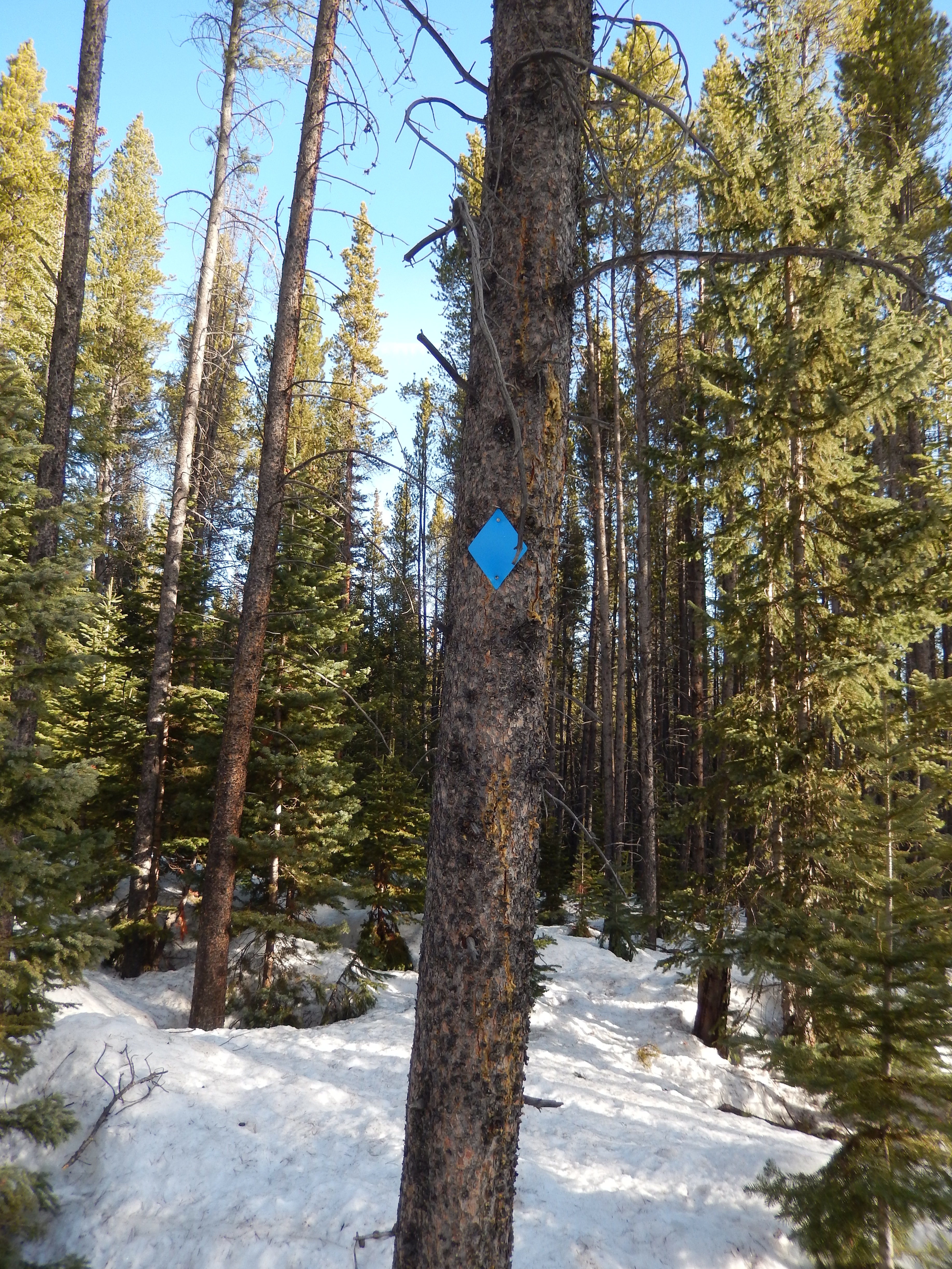 It was just after this we ended up on a Nordic Center snowshoe trail, which threw us because we didn’t remember seeing a trial break.  Fortunately, I had sort of  remembered from our snowshoe at the Nordic Center(snowshoe details here) that there was one part of the trail system that merged with the Peaks Trail so we kept moving forward and kept an eye out for a blue diamond.  I do have to say when it went off on its own there was absolutely no snow the way it went, I was a little jealous, I am definitely done with snow.